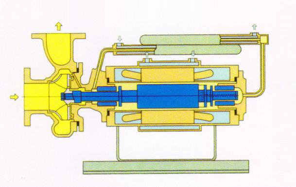 這種泵全部帶連接體是能輸送熱油等高溫液體的泵,高溫液體經熱交換器冷卻后進入電機腔,在副葉輪的推動下重新進入熱交換器,形成電機腔內液體的自循環由于連接體和襯套構成的阻尼作用,兩邊的液體幾乎不混合在一起。